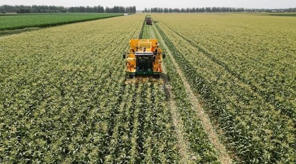 切割秸秆、摘穗、入仓……智能化多功能大型玉米收成机正在甜糯玉米种植里来回穿越,整个收成过程趁热打铁。